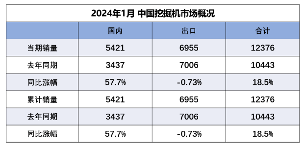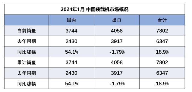 2024年1月份挖掘機、裝載機銷量分析:國內大幅增長,出口小幅回落